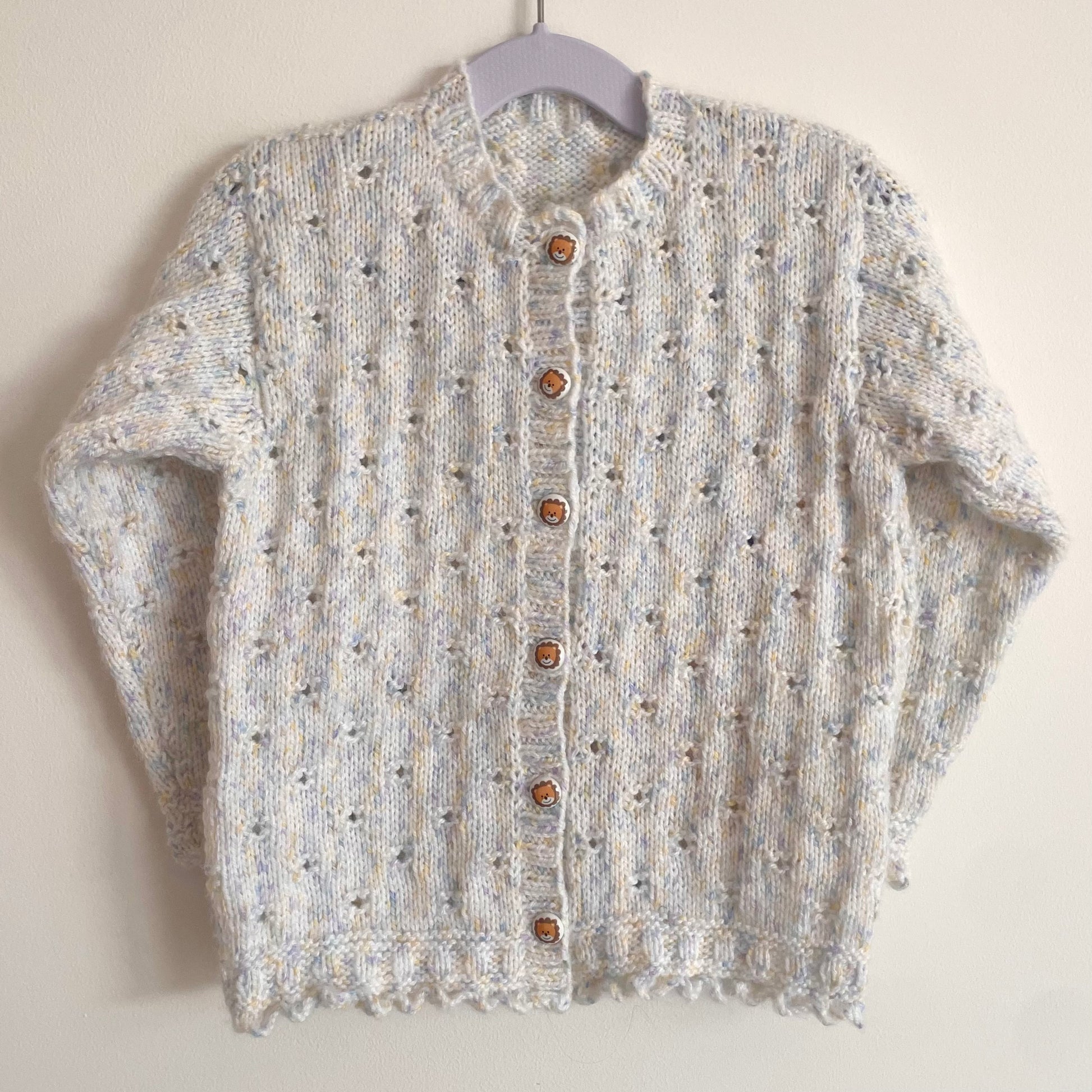 Hand-knitted cardigan with hand-crocheted and hand-embroidered embellishments.