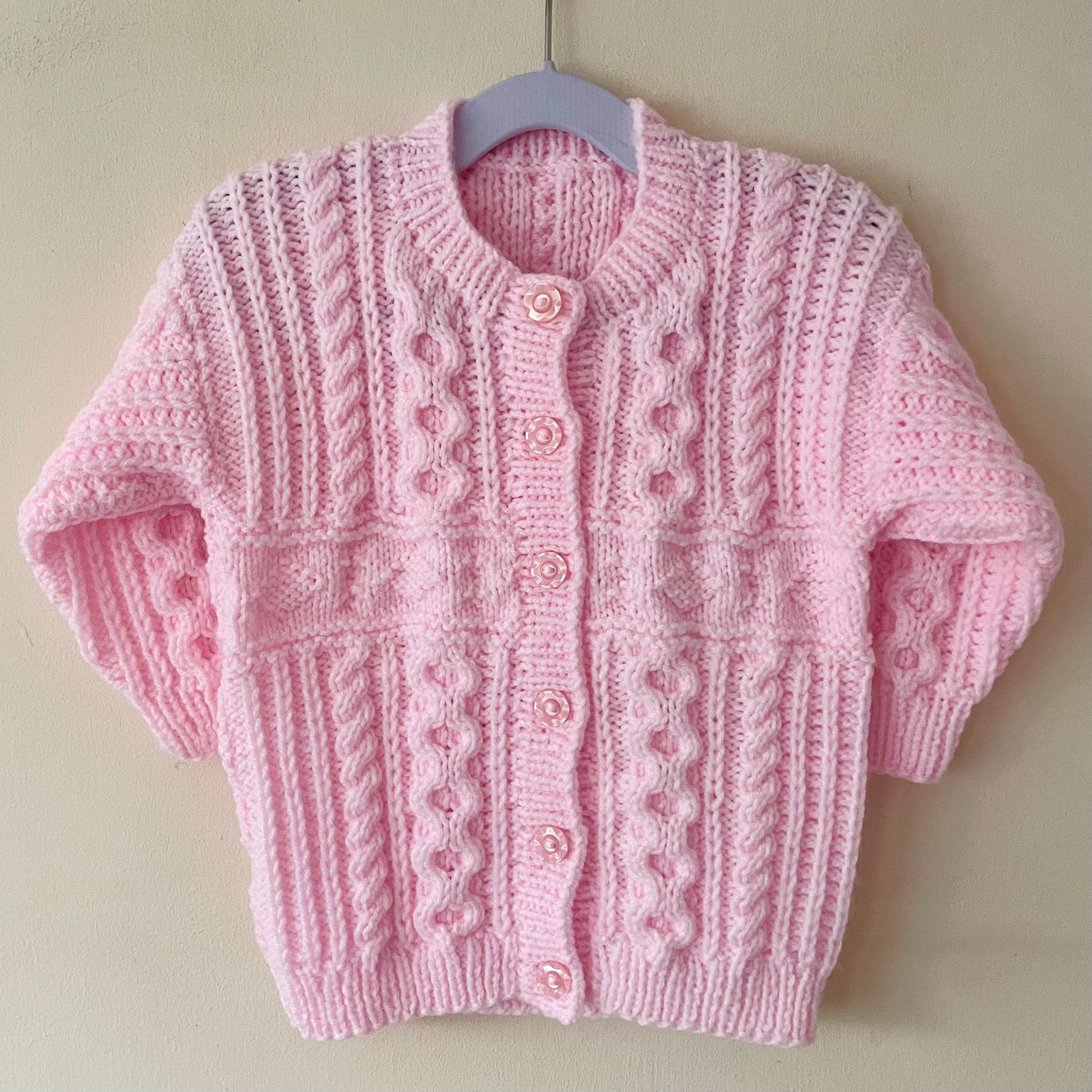 Hand-knitted cardigan size approximately 2-3 years (see measurements below).